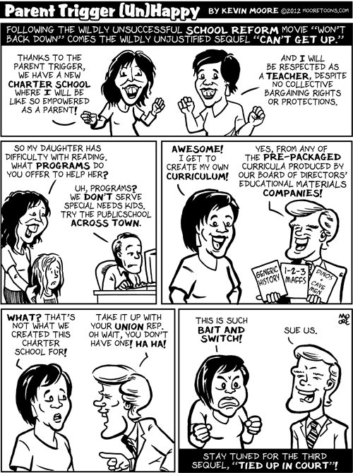 Newly added to the Learning Curve page, a cartoon about “Won’t Back Down” and the parent trigger option it propagandizes. The real challenge of this cartoon was rendering Maggie Gyllenhaal and Viola Davis in a cartoony fashion, less caricature, more cartoon character (subtle difference, I know.) I think the top panel is successful, Maggie reads well in the second, but Viola slowly falls apart. Not her fault, she is a great and lovely actress, despite her appearance in this POS film; but I subjected her to the narrative demands for cartoony facial expressions.